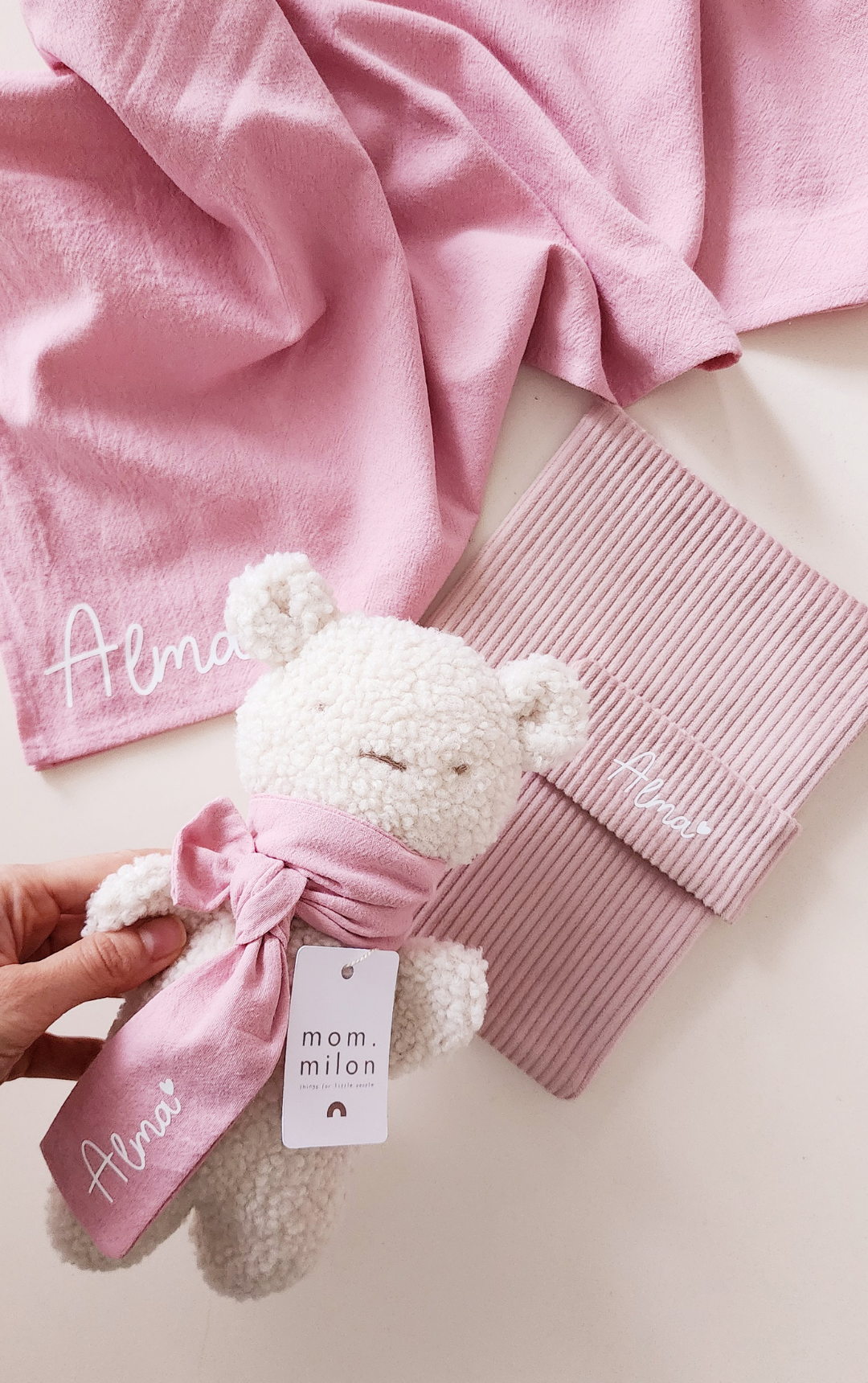 Todo va estampado con el nombre del bebé, se puede elegir entre el oso de corderito o el oso clásico